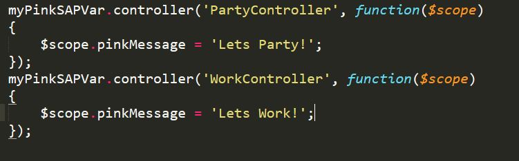 All the business logic can be written in controllers, it can be written by having a $scope injected to the function. This scope can be used to add behavior to the controller, in this example I have created two different controllers – PartyController and Work Controller which display data associated to $scope.