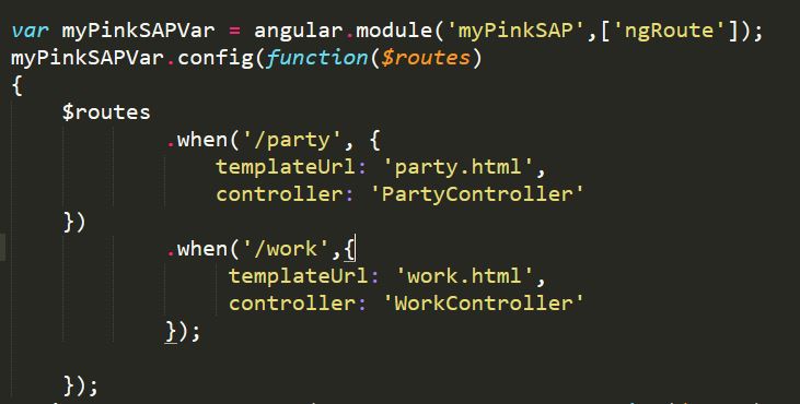 In the above example, myPinkSAP is my module. What is a Module? It is the one where all the services, directives, controllers are stored in. And I have associated this module with a variable name called myPinkSAPVar. Now, the variable is used to configure our routes by injecting provider. And the module has a dependency of ngRoute. The syntax of it is – .config(function(injectables)